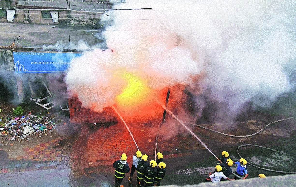 Traffic on the road slowed down as curious residents and passers-by thronged the spot. Thick black smoke and orange flames were billowing in the air sending shivers down the spine. The bursting fire-crackers caused panic in the area. For fire-fighters, who reached the spot from Sugat Nagar Fire Brigade Station, it was a tough situation. Seeing the intensity of flames, back-up was immediately called as the inferno had spun out of control owing to presence of combustible material. Soon additional tenders were dispatched to the spot from Lakadganj, Kalamna, Ganjipeth, Civil Lines, Trimurti Nagar, Wathoda, Sakkardara and Cotton Market to tackle the fire. About 60 fire-fighters battled for over six hours to control the flames.