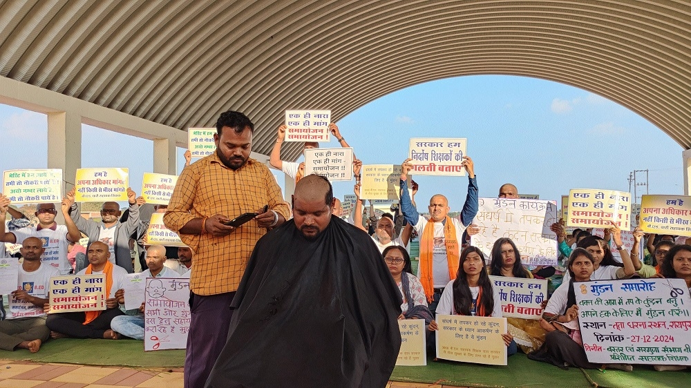 Terminated B.Ed teachers shaved their heads as part of their protest against their illegal termination.