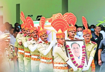 Amid outpouring of emotions and slogan shouting, people stood on both sides of the road as Rupani’s mortal remains were brought from the airport to his residence in Rajkot, and from there to the crematorium, a journey stretching to several kilometres in a flower-bedecked vehicle.
