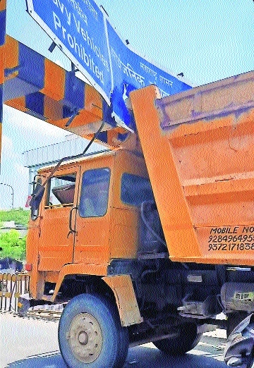 With height-barriers damaged at both the ends, the exercise to deter heavy vehicles from plying on Shahid Gowari flyover remains futile. (Pic by Anil Futane)
