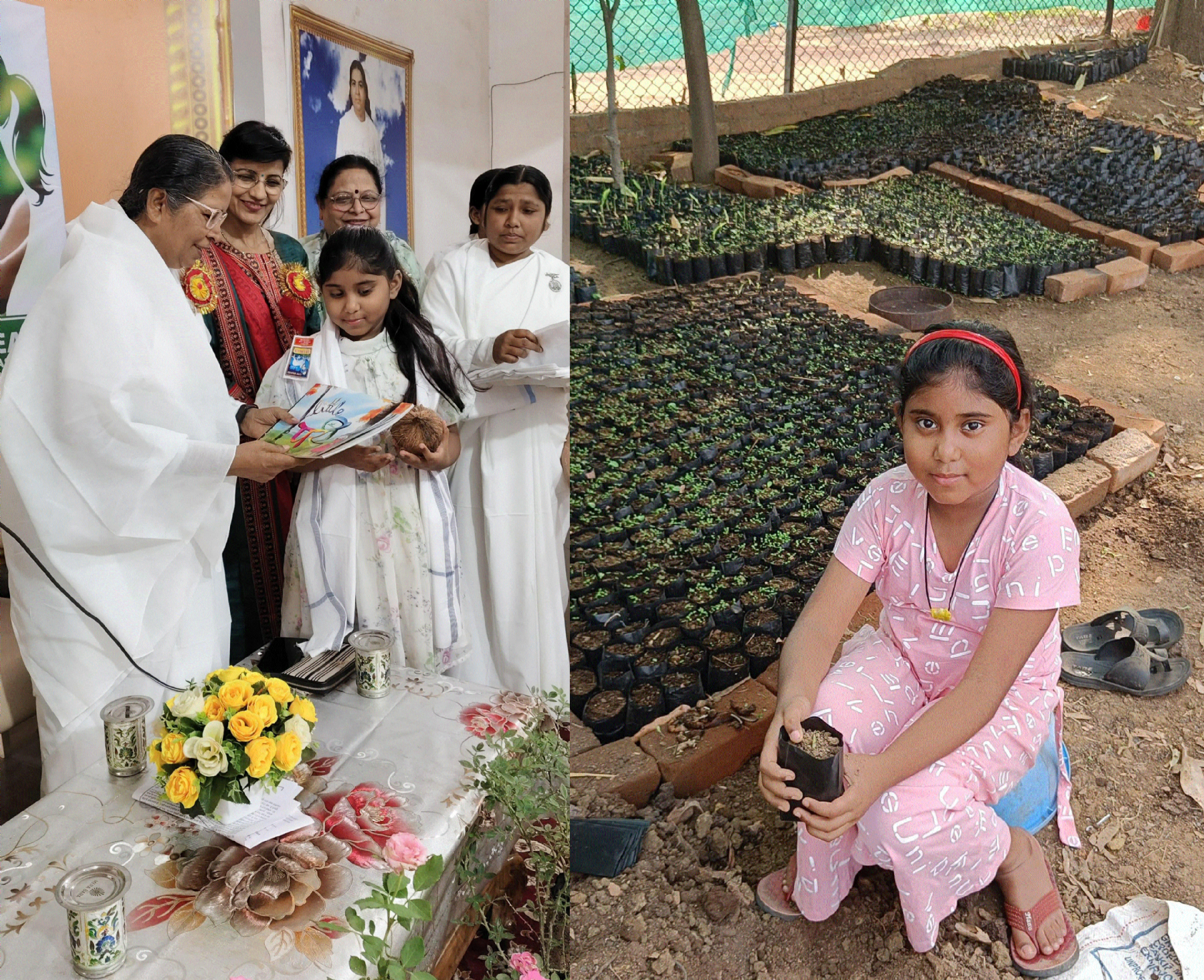 Khushika Sahu, seated on the soil, holding a sapling, surrounded by hundreds of young plants she nurtured, was felicitated by Brahma Kumaris dignitaries.