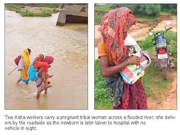 A tribal woman from Satalutoli village in Manora tehsil of Jashpur district was forced to deliver her baby on the roadside after being carried across a flooded river by two Asha workers.